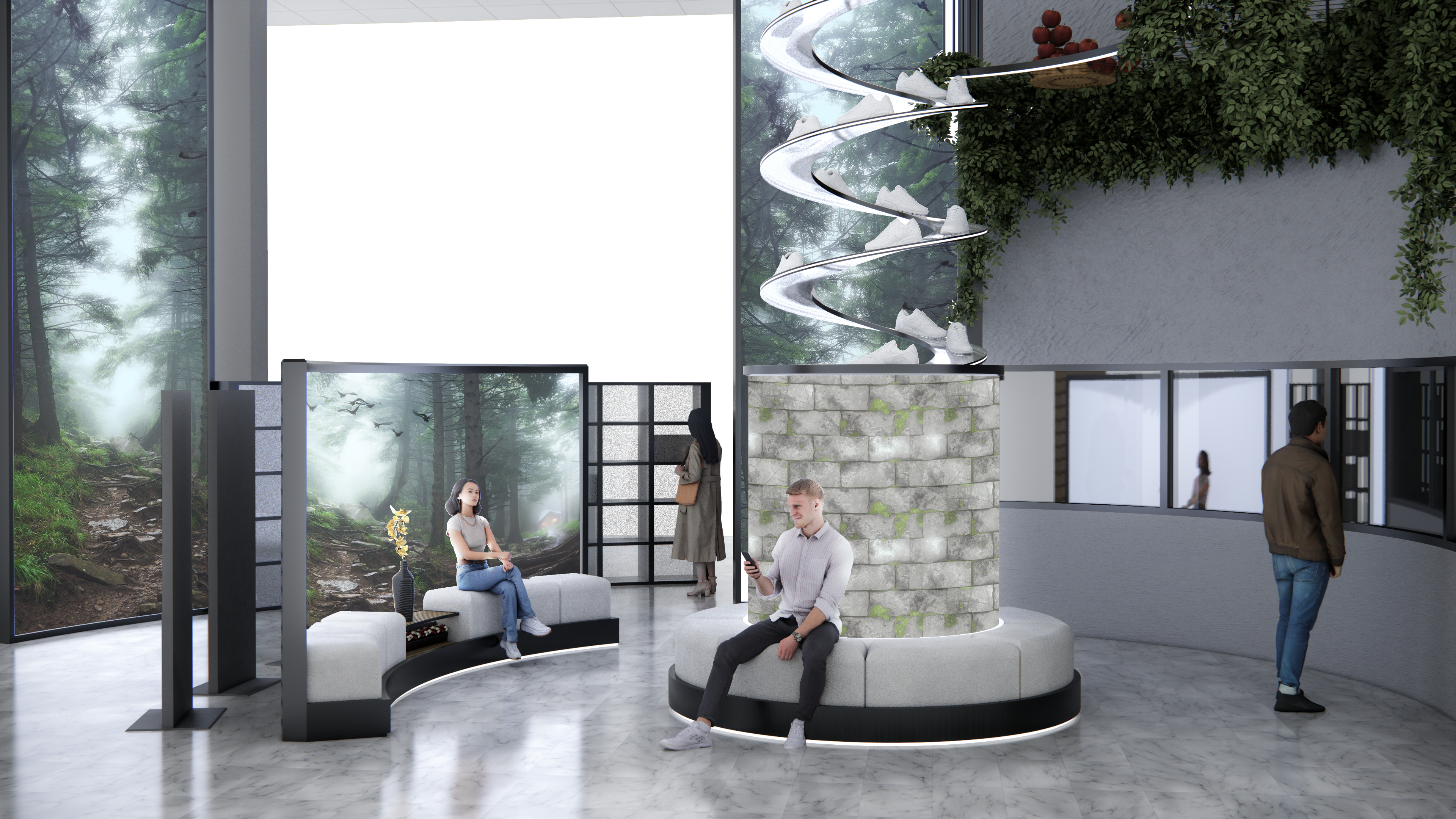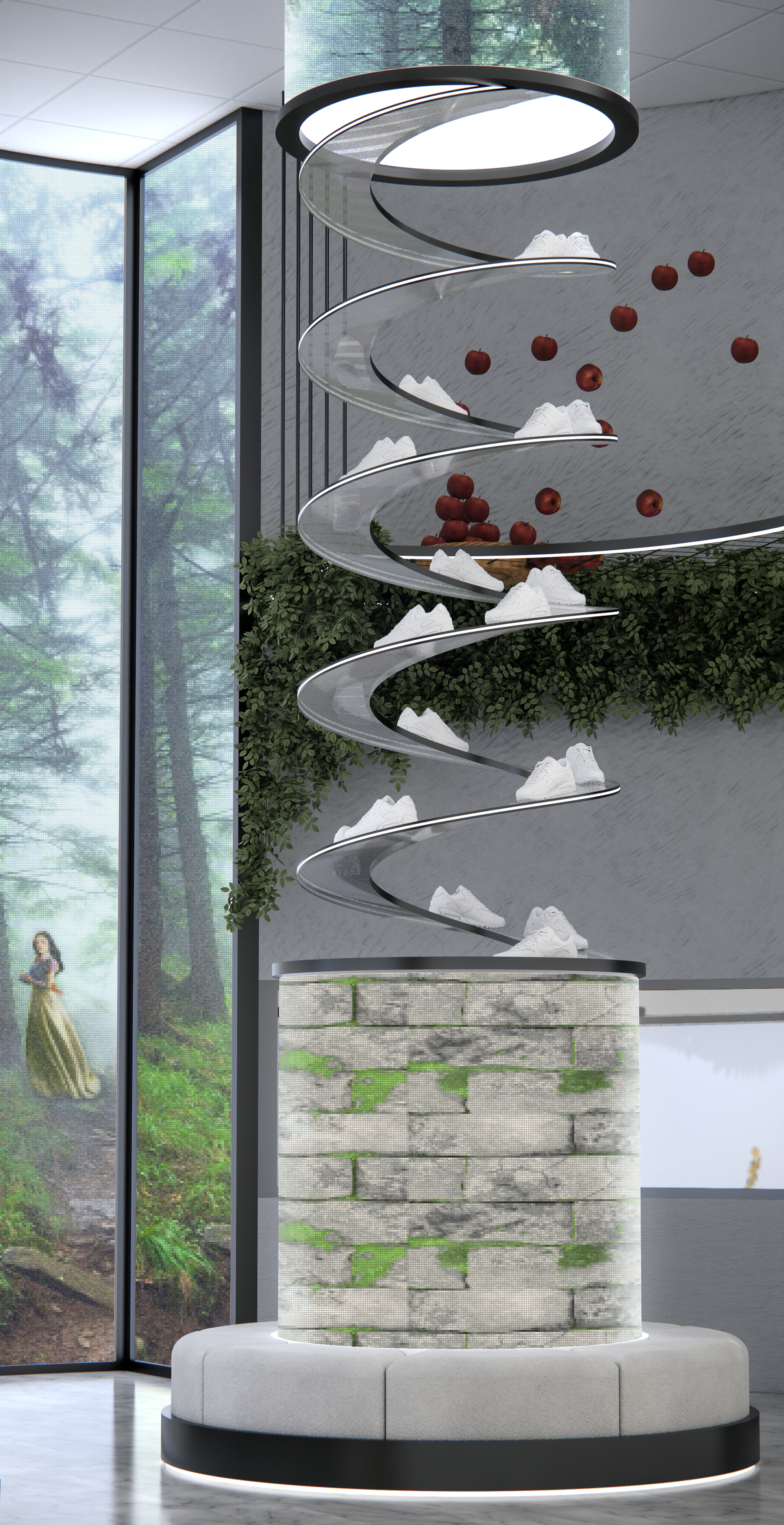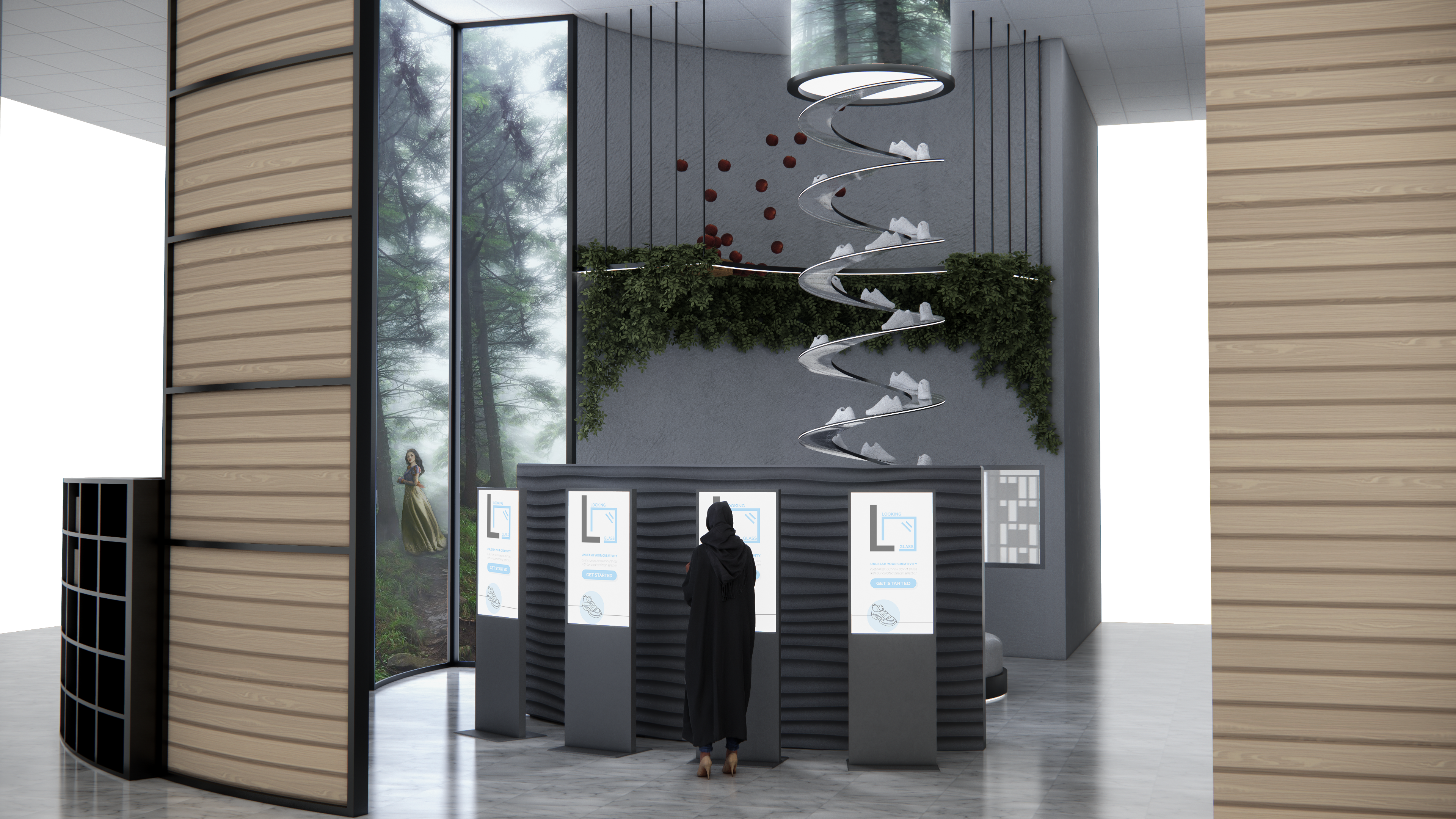 This in-store view features a dynamic spiral shoe display surrounded by ambient forest visuals inspired by Snow White and modular seating for moviegoers waiting or customizing orders.