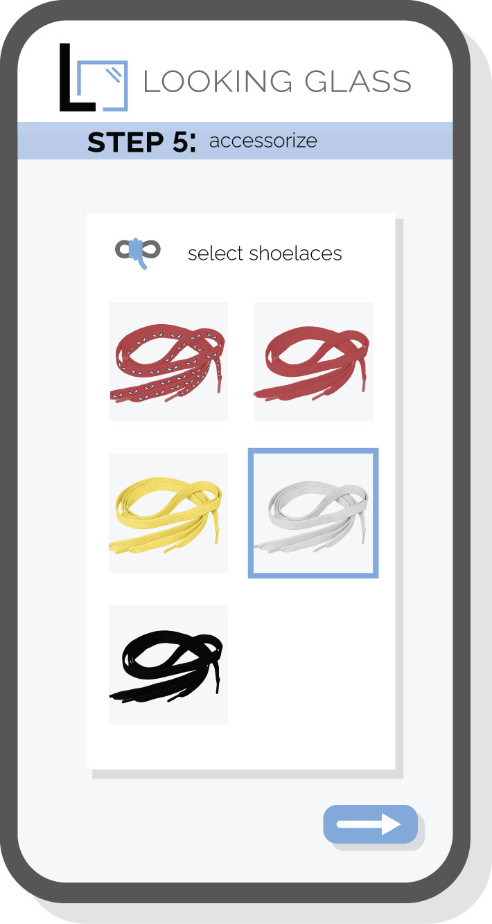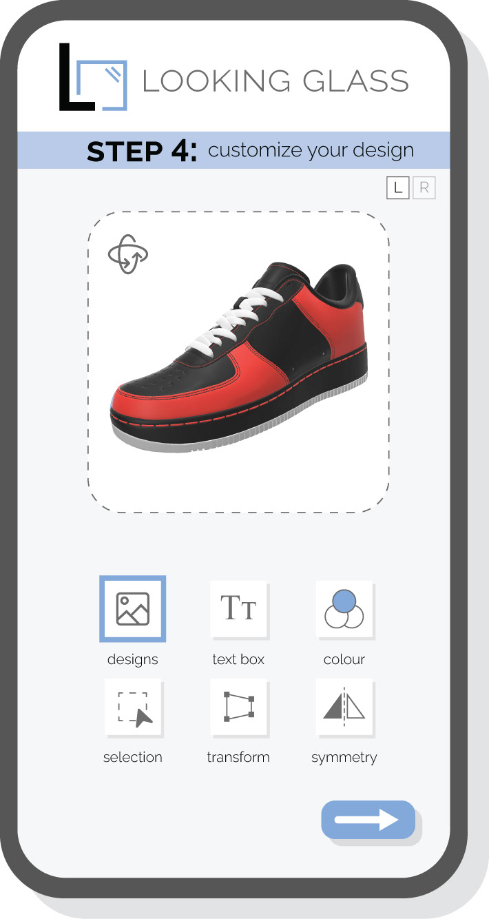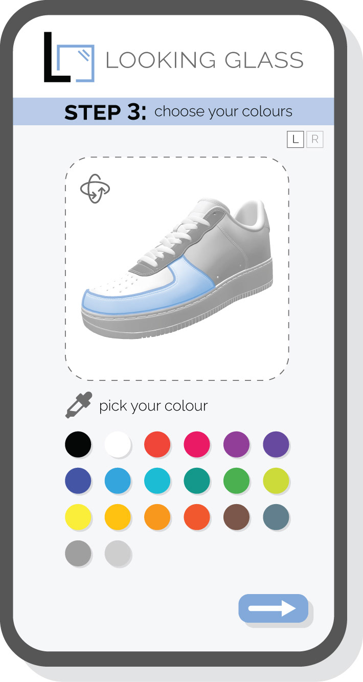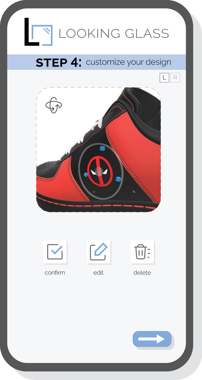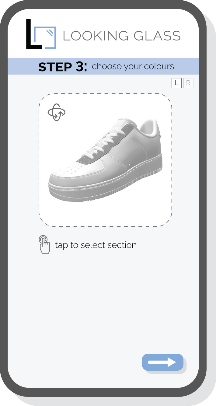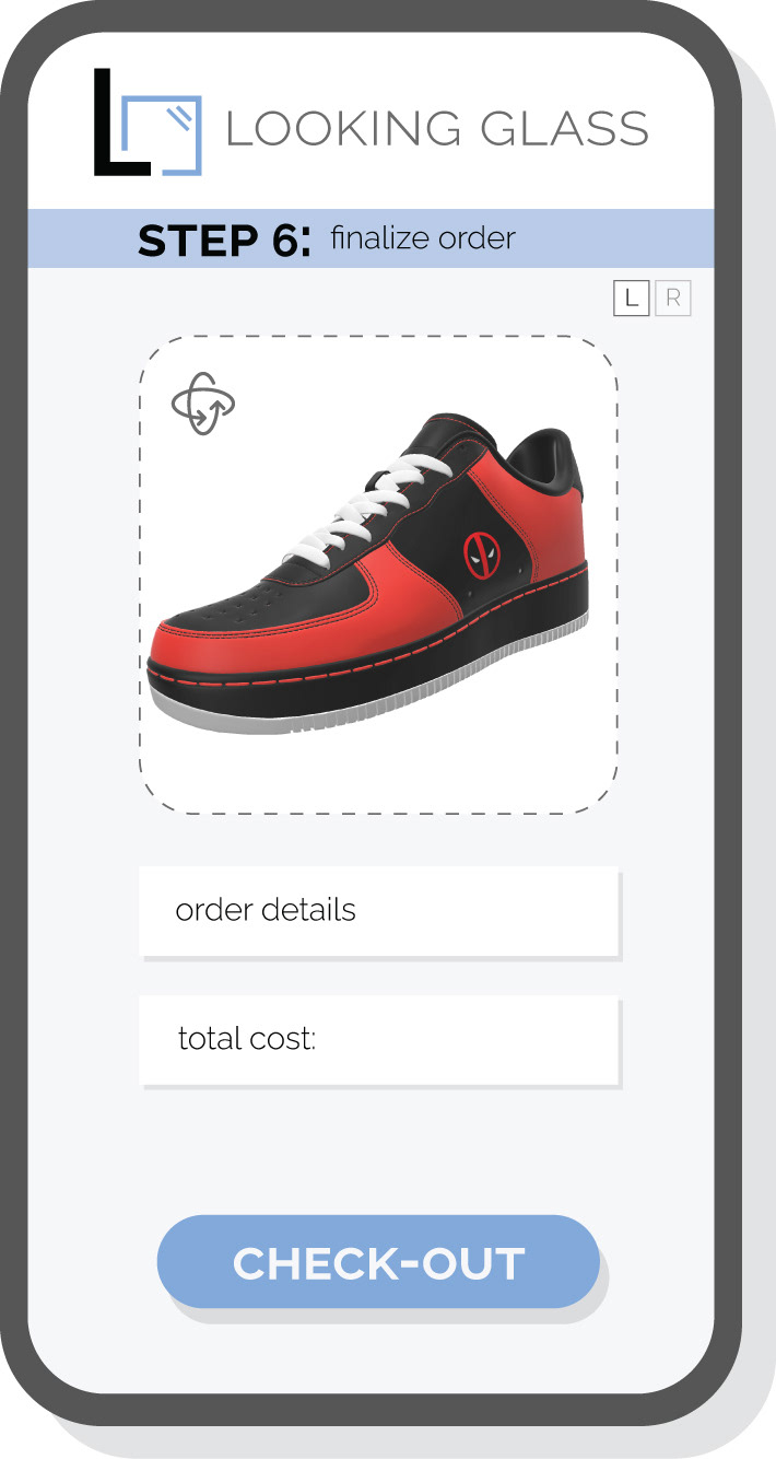 The in-store kiosk interface was designed with a custom UI that adapts to the current blockbuster. Users are guided through a seamless UX journey, from selecting a film to customizing detailed elements of their sneaker.