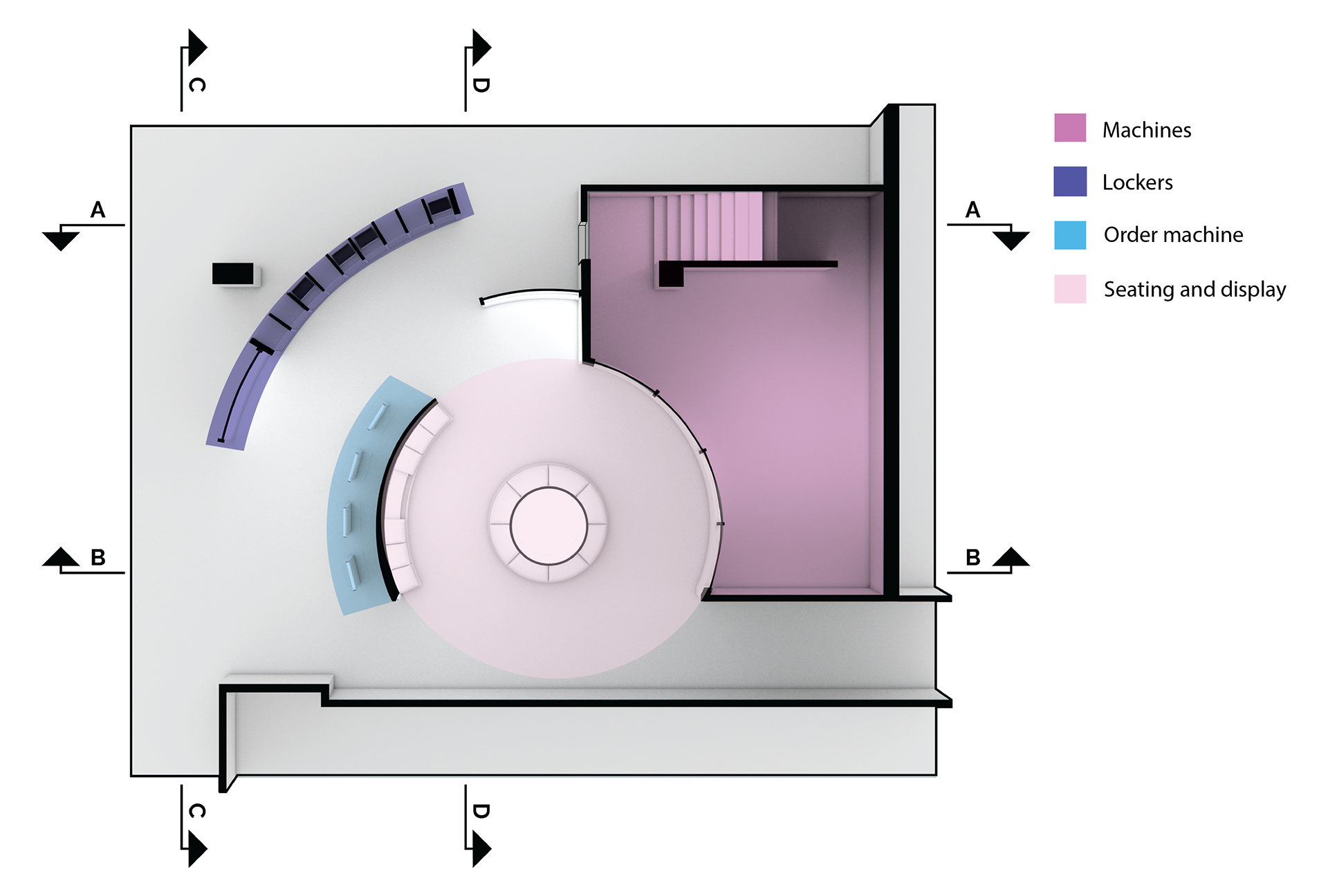 Zoned floor plans showing user journey from customization to collection, with designated areas for digital interaction, order processing, and retrieval zones via lockers.